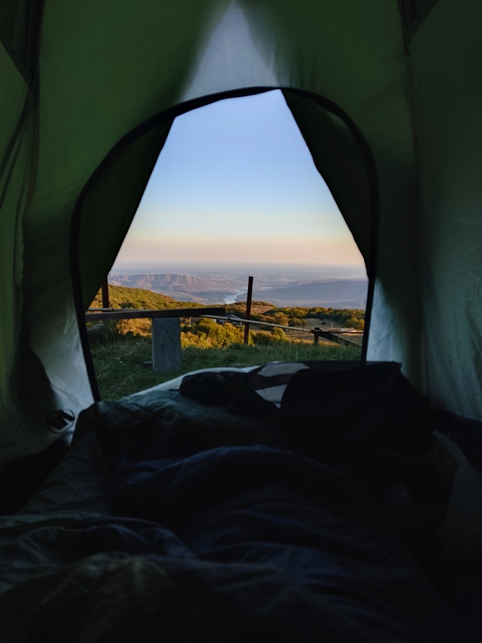К вечеру добрался до кемпинга около г.Дубки, поставил палатку таким образом, чтобы утром пить кофе с прекрасным видом из палатки.