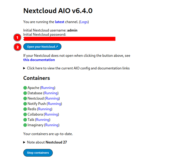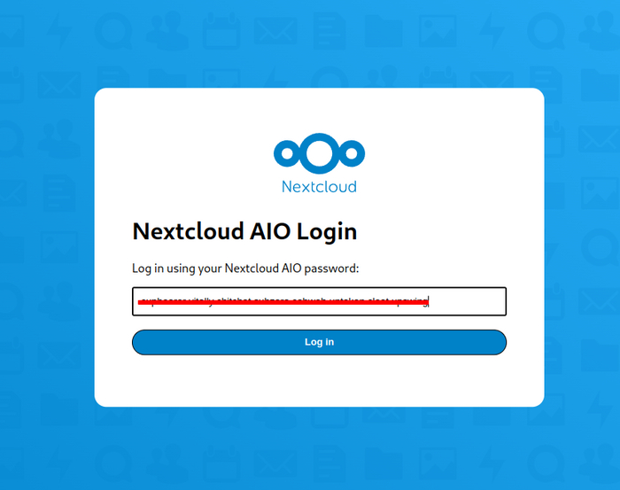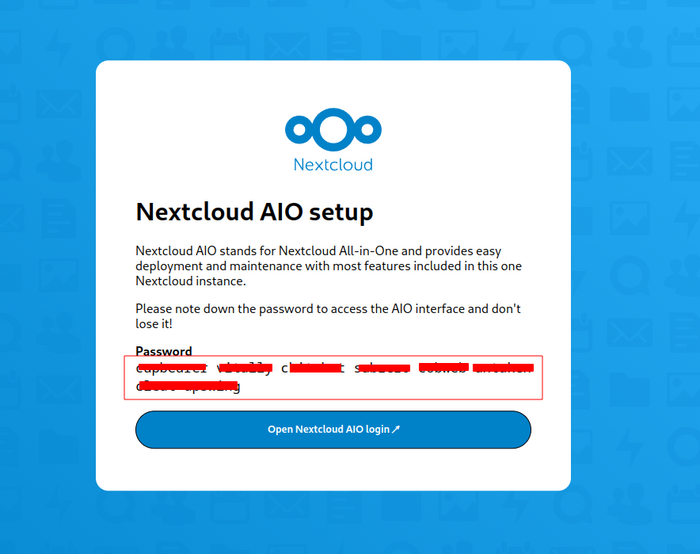 2. Копируем парольную фразу целиком и где-нибудь сохраняем, просто на всякий случай и нажимаем кнопку Open Nextcloud AIO login