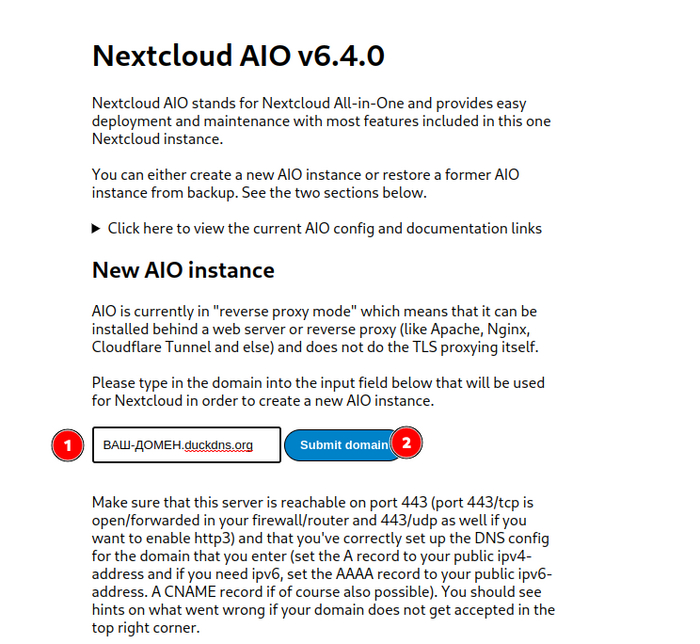 Не забываем указывать https и порт, автоматического перенаправления для контейнера установщика к сожалению нет(но есть для уже работащего Nextcloud)