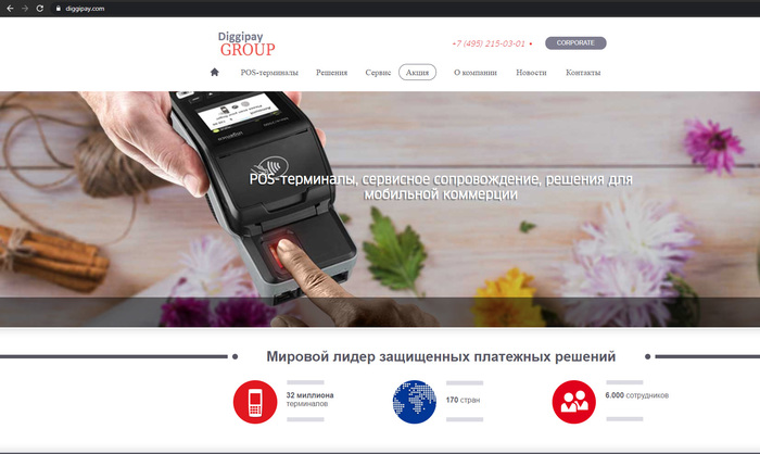О халява привалила, давно ждем, ну чтож пойдем посмотрим, чего я там выиграл, лежа на диване). Ок, гугл кто такие diggipay.com? Гугл в ответ - хз, сам первый раз слышу. Но одну ссылочку всеже выдает, тыц. Оказывается есть отзывы победителей данной акции, музыку сони выиграли, а в коментах айфон 11 товарищу привалил. Если поискать по тегам на указанном выше сайте, то находятся несколько малозначащих записей аж от 2017 года про данную контору. Интересненько. Топаем на указанный сайт и что видим. Сайт в домене первого уровня, контактный телефон, сам сайт не одностраничная заглушка, а замороченный с кучей графики, перед нами господа мировой производитель POS-терминалов, даже кнопка "Акция" имеется.