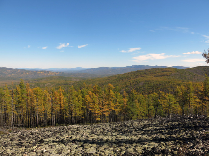 Склон – отличный, где надо – глыбовые развалы, где надо – практически парковый лес, то лиственница, то береза. Круто правда – 20-25 градусов, а участками и все 30. И парит, то ли после дождя, то ли перед. Тучи свинцовые по-прежнему висят у горизонта. И породы, такие, многообещающие. Руда где-то рядом…