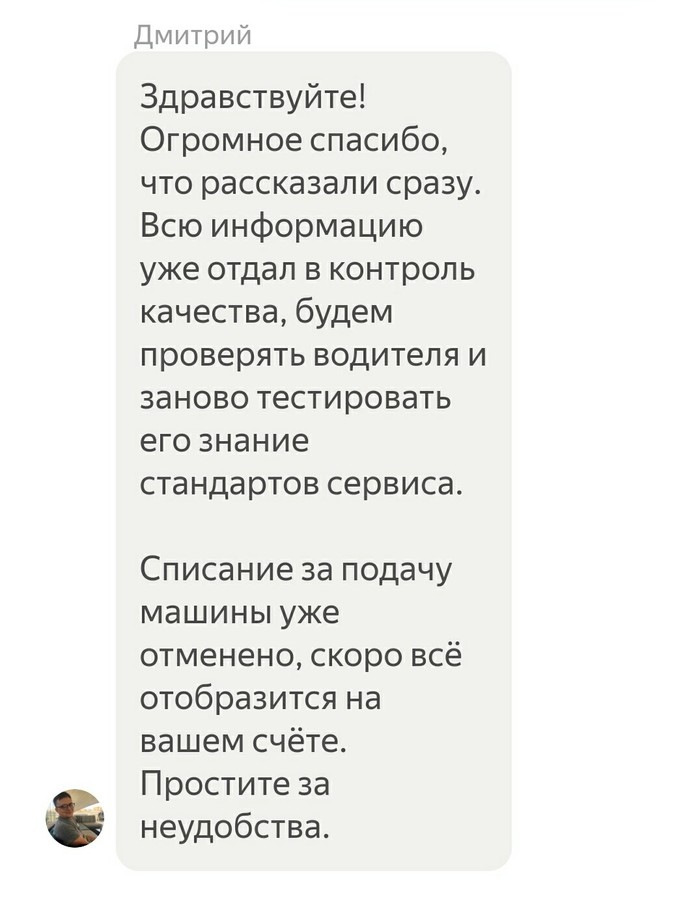 Случилась только что неприятная история. Есть некоторые водилы - мудаки. И вот как раз на такого я попался. Схема проста - не доезжая до места водитель отмечается, что уже прибыл и далее тупо стоит на месте, деньги за ожидание капают и при отмене заказа с вас списывается минимальная сумма заказа + за ожидание. Но удивила больше не его тупость, а реакция тех. Поддержки. Номера в приложении я не нашел, но он оказался и не нужен. Далее часть, которая может кому-то поможет в дальнейшем не лишиться хоть и небольшой, но все же неприятно выкинутой на воздух суммы денег. Нужно в боковом меню зайти во вкладку "Служба поддержки" и всего лишь описать свою проблему. И вот тут второе, что меня удивило. Ответ пришел через минут 5 и вернули все деньги без вопросов. Реально удивлен работой ТП. Надеюсь, что водителя - идиота уволят. Яндексу - спасибо)