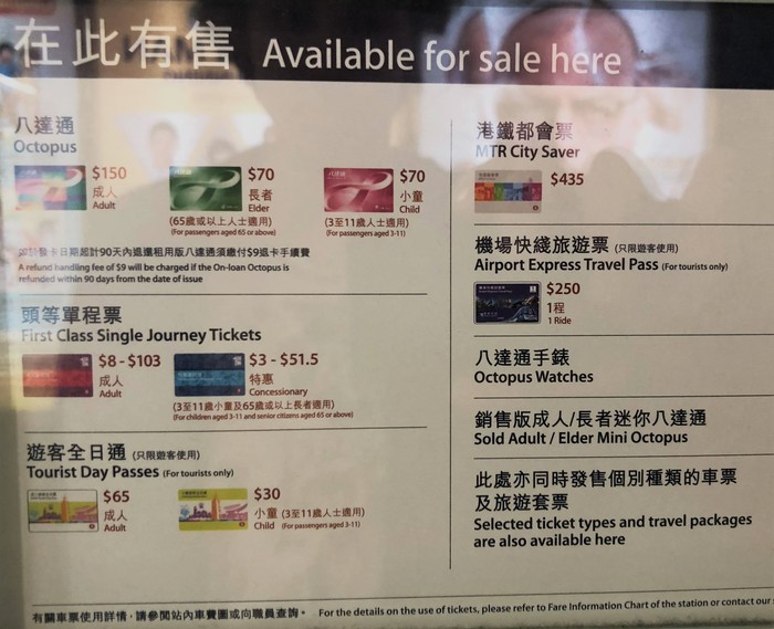Также доступен к покупке туристический билет за 65 HK$ (560 рублей), дающий возможность одни сутки ездить без ограничений, и MTR City Saver- за 435 HK$ (3730 рублей) у вас будет доступно 40 поездок на срок 40 дней.