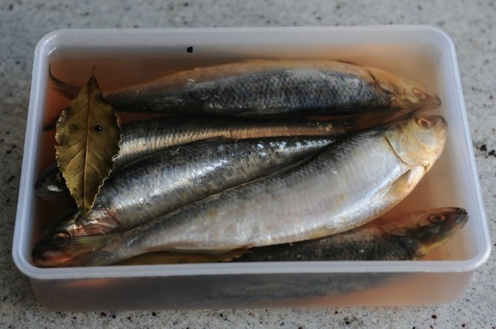 В рецептуре рассола придерживаюсь строжайшей классики, если можно так сказать. В общем беру кастрюлю, набираю водой и довожу до кипения. Затем засыпаю туда специи (всевозможные из магазина, которые Вам по вкусу), перец черный горошком, перец душистый горошком, лавровый лист и соль. Соль сыплю из расчета 100 гр/л. Лавровый лист и специи кладу обильно, в зависимости от объёма рассола. Все это кипятится примерно 5 мин, затем необходимо остудить и залить этим рыбу.