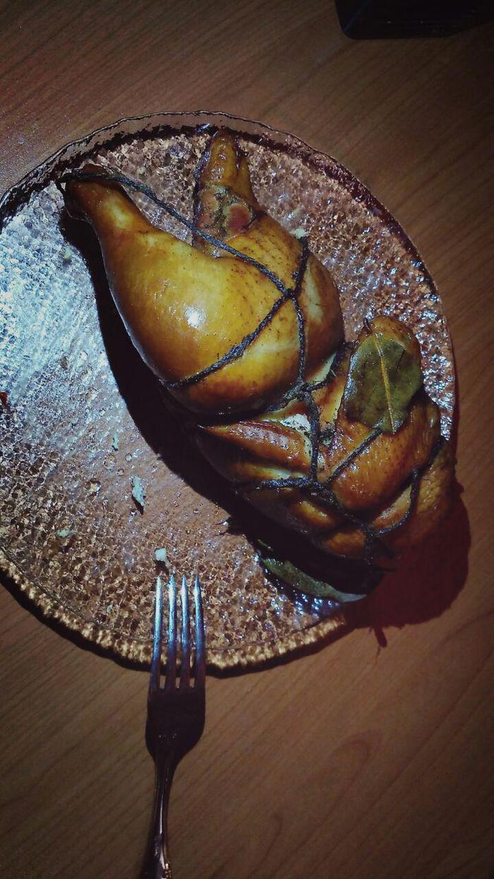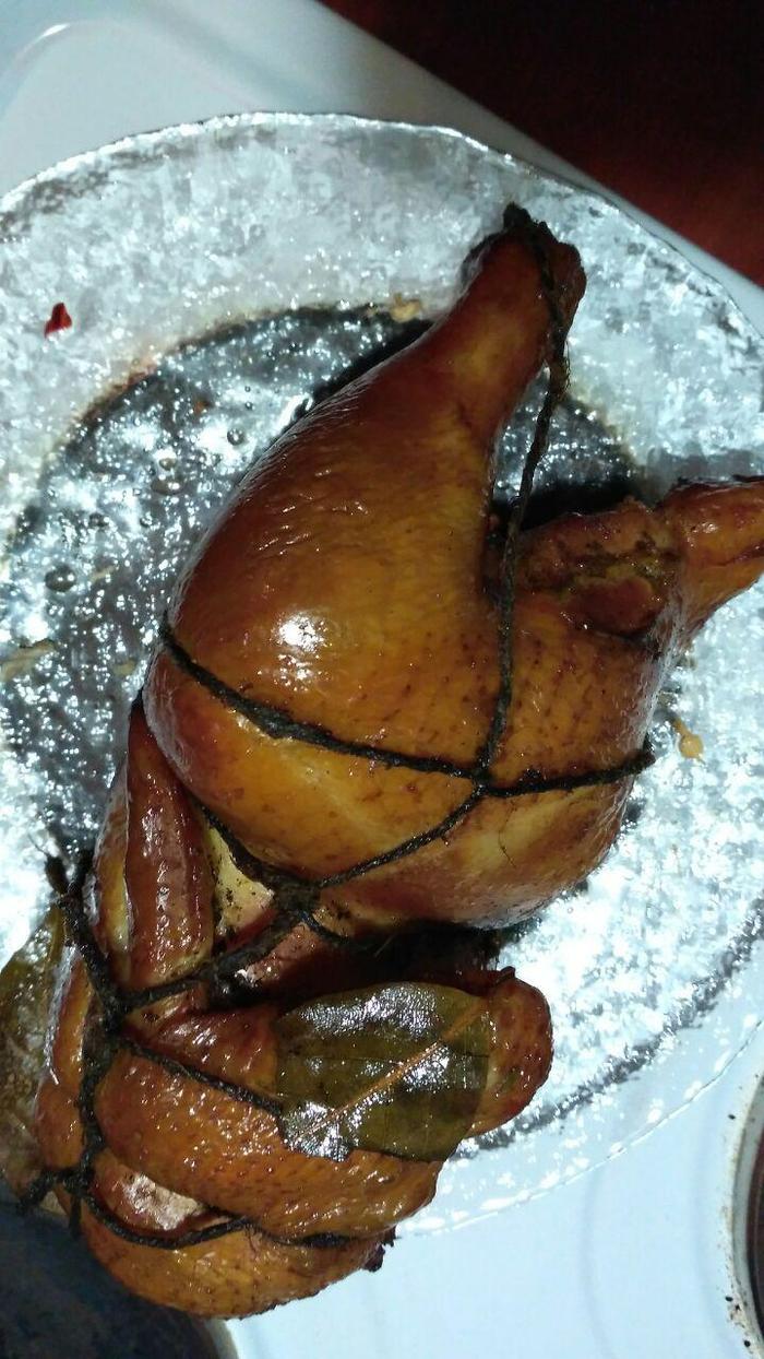 Вечером достаем курицу, смываем с неё остатки специй, сок и готовим жидкий рассол. Рассол делаем приятной солоноватости, с добавлением специй (в моем случае немного карри, соль, лавровый лист, перец душистый молотый) и отвариваем там курочку в течение 5-7 минут. Т.к. полутушки уже были обвязаны, то достать их не составит труда.