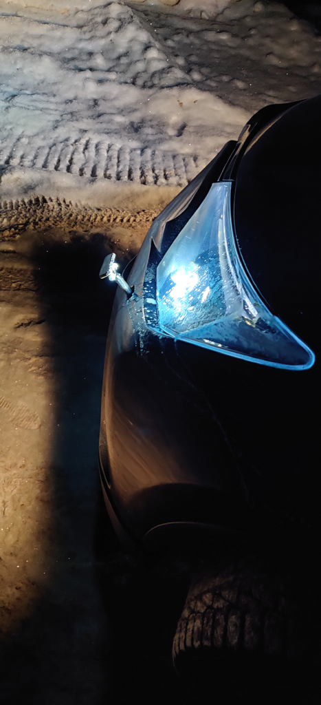 Короче, в Вологде, где температура упала до -11 -12, незамерзайка стала густеть и размазываться по лобовухе какой-то белесой пленкой. Обещанные -30 оказались большИм преувеличением((((( Жидкость стала густой, как кисель и уже еле выдавливалась из форсунок. Еще через 400 км, в карельском городке Пудож, где мороз был уже -18 - 19, жижа уже окончательно замерзла и размазывалась хлопьями льда по форсункам. Омыватель фар (а он, к сожалению, неотключаемый, срабатывает каждый пятый раз чистки лобовухи) - не выдержал, подлец, даже не смог закрыться, сковало льдом (на фото).