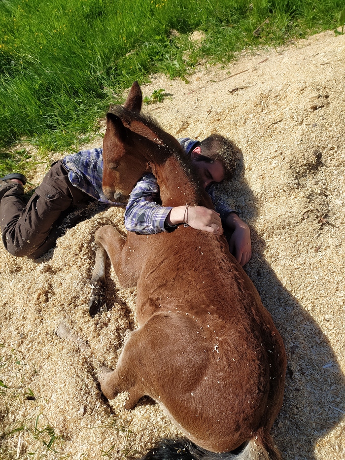 Даже и тени злости не отразилось на лице человека. Он сразу понял, кто к ним присоединился. Игривая пони Бастилия, всегда жаждущая контакта с человеком. Она обнюхала человека с головы до ног, дотянулась до плеча своей мордочкой и попробовала положить её на плечо (оказалось, всё-таки высоко, неудобно задирать). И продолжила докапываться до человека и так и сяк, лишь бы как-то поиграть.