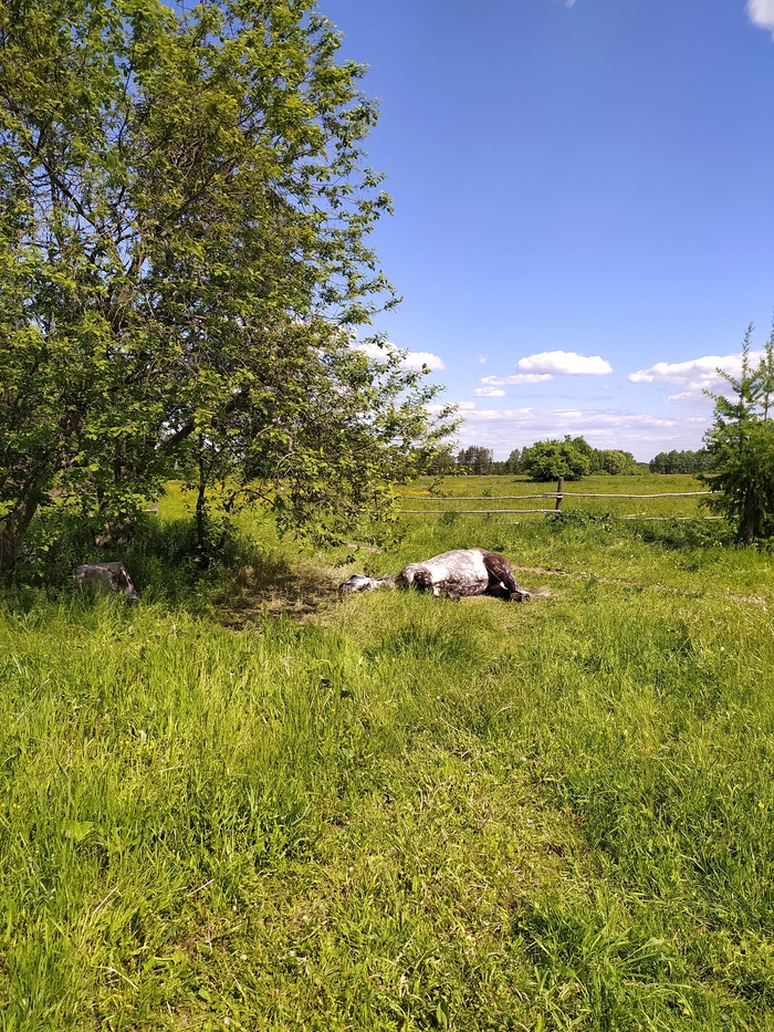Итак, весенним вечером с розовеющим небом к компании у забора подкрался Голиаф. Он положил нос на круп Ванды (на попу), прикрыл глаза и просто был рядом, пока Ванда стояла всё так же в ореоле нежной мечтательности о жеребцах. И она показывала ему взаимность: она не прогоняла его.