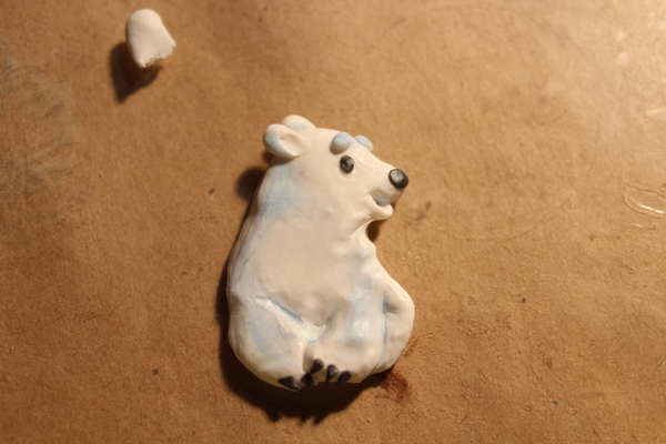 Затем отдельно лепим ноги и с помощью стека прилепляем их к основе. Вжух и мишка уже с ногами (и с коготочками), глазами и носом. Стеком с лопаточкой можно сгладить все неровности или сформировать нужный вам рельеф.