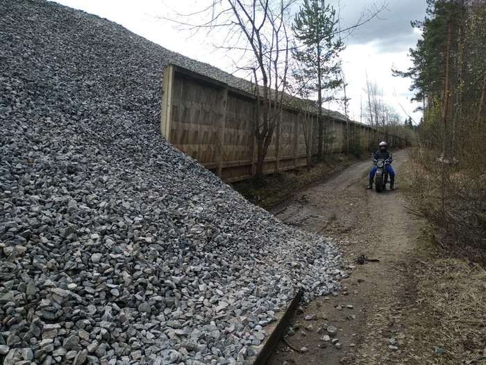 Ну и опять- та-даааааам! Завалили щебнем от жадности всё и вся, но немножечко своими куриными мозгами не подумали. И вот, забор бетонный лежит на нашей дороге, а под забором трупики. Шучу. Хотя, поди знай.