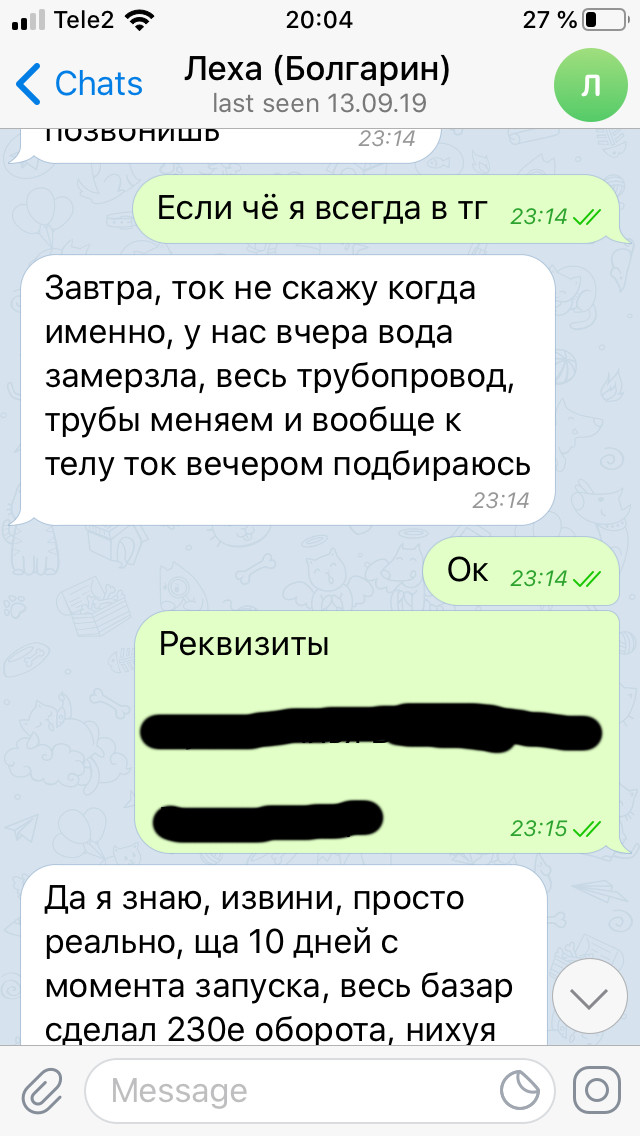 Это все происходило под новый год, я разрешил ему отсрочить платеж до 27 декабря да еще у него тут бизнес появился.