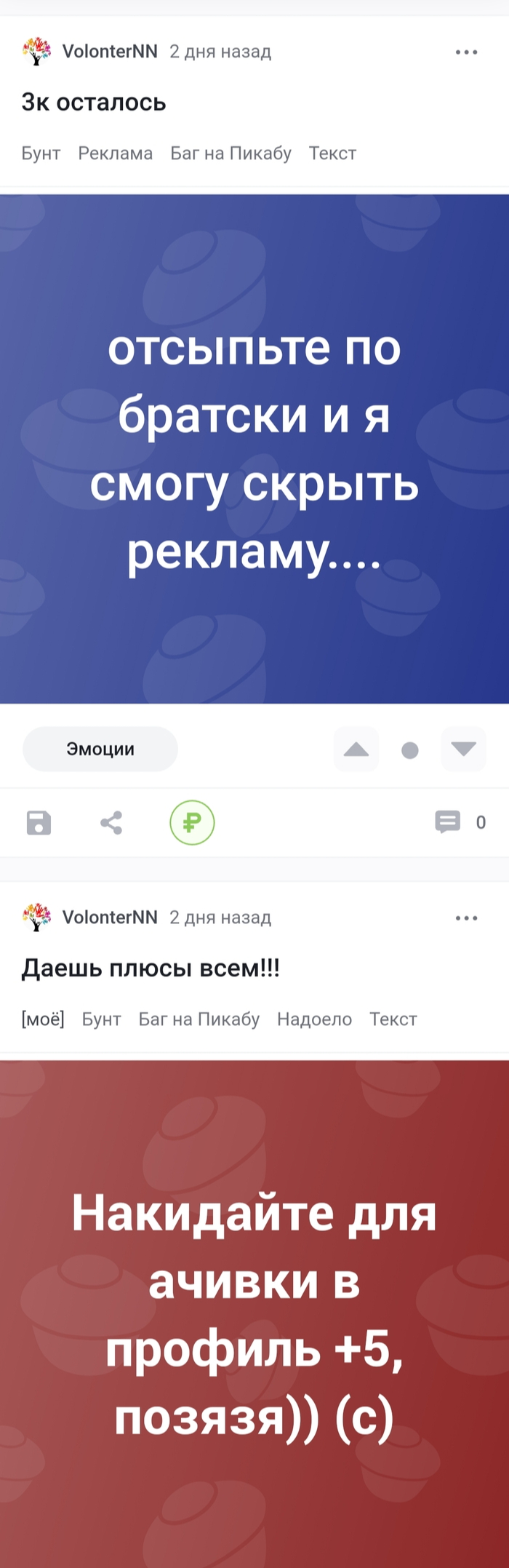 Причем в нашем же. Поначалу пусть и кривая, но логика все же была - забить ленту спамом, чтобы в нем утонули рекламные посты тг и прочий контент. Так по идее случился бы отток пользователей. Но есть нюанс. Преодически в ленте начали выскакивать посты попрошаек, которые бунтари радосно заплюсовывали. И тут плотину прорвало, на халяву слетелась куча кармодрочеров, и трафик наоборот взлетел, что только на руку пикабу. Некоторые даже попрошайничали по несколько раз.
