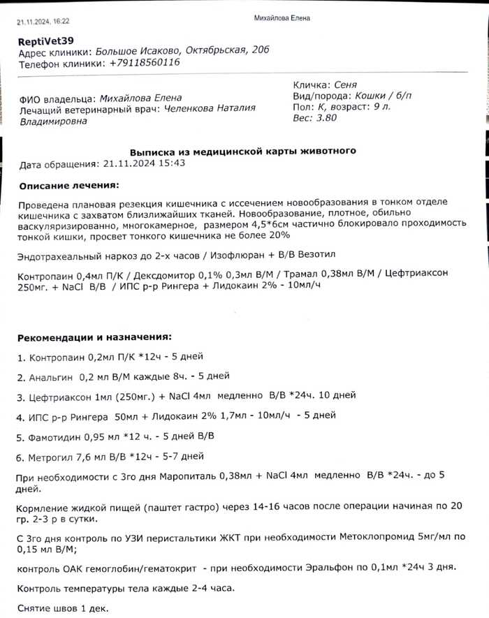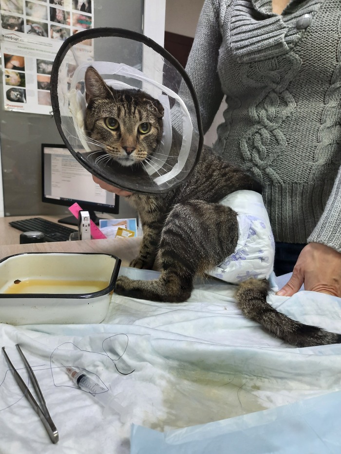 У него была большая онкология на кишечнике. Выглядела она лучше чем у Сарочки, метастаз не было видно, у нас был какой-то шанс вытянуть его. Этот самая тяжёлая операция на кишечнике, сказала Наталья. Если кот переживе́т трое суток, есть шанс выжить...