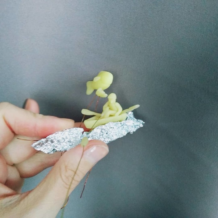 Пауки и человек сделаны из полимерной глины.