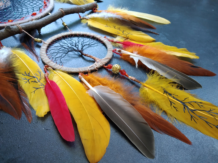 Вообще я занимаюсь изготовлением индейских головных уборов, это скорее сопутствующее творчество для утилизации оставшихся материалов. Не совсем традиционные ловцы снов с паутинкой, а скорее вариация.