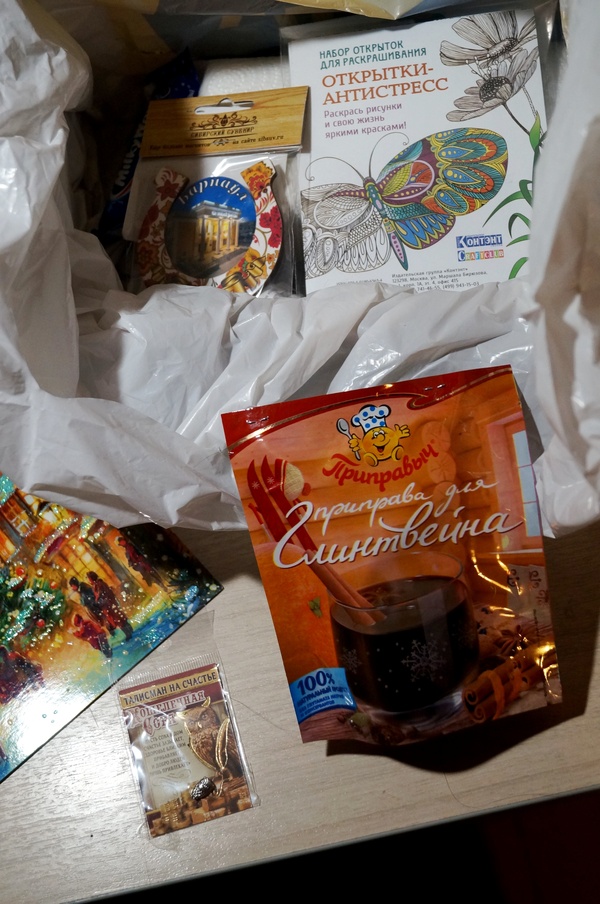 Посткроссер в моей душе радуется открыткам (хотя я даже раскрашиваю так, что глаза выпадают), сова поселилась в кошельке, а приправу я в ближайшее же время засуну в вино и выпью его. Съем. Ну, понятно. Магнитик занял почётное место на холодильнике =)