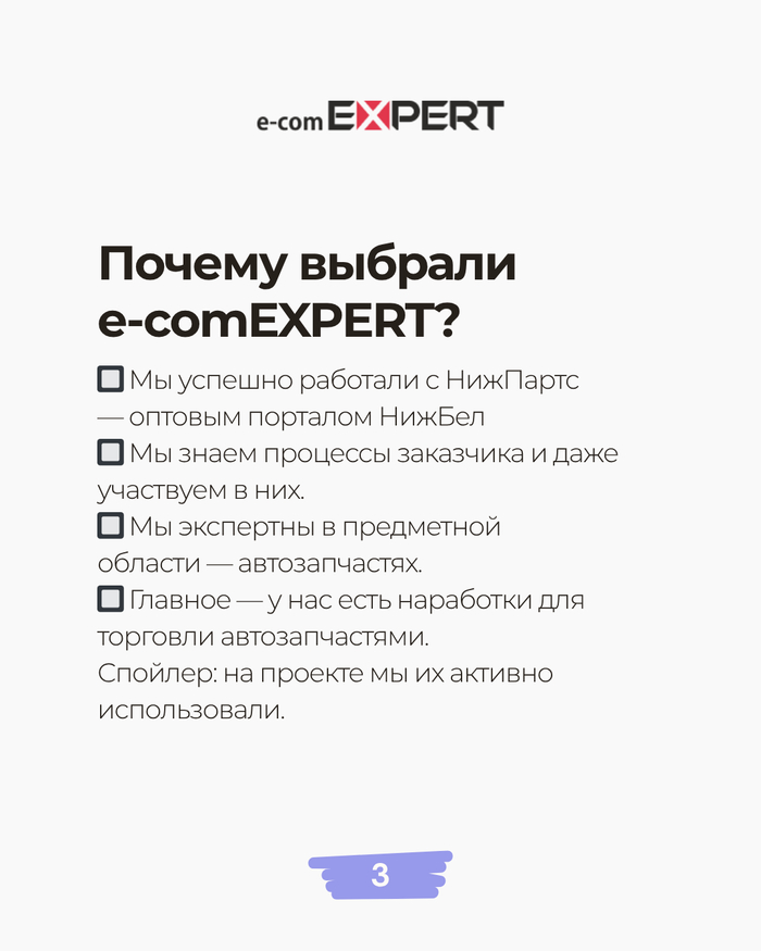 Чтобы внедрение прошло грамотно, подрядчик должен иметь опыт не только в коде, но и в самой нише — понимать специфику B2B и B2C, интеграций и работы с автозапчастями.
