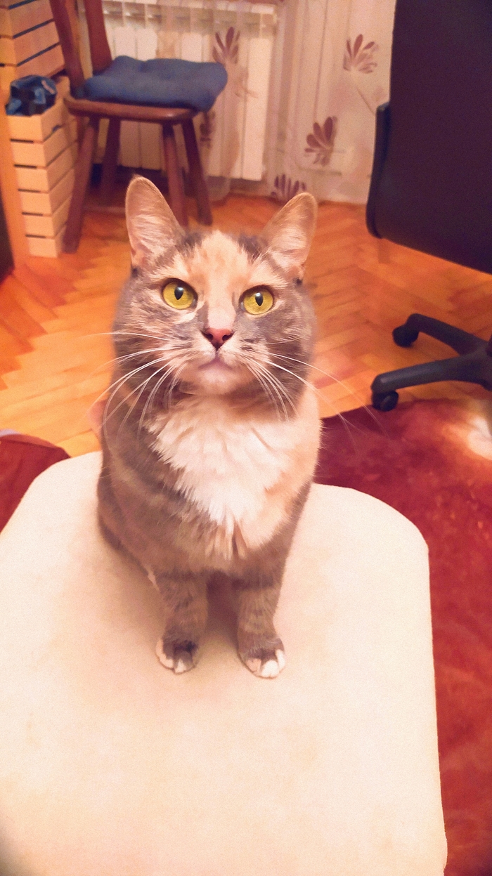 Вот эта мамзель, замершая от ужаса пролетающих над ней машин прямо на полосе движения, была схвачена своим человеком и теперь пол квартиры в ее местах "лёжки". Зимой мы любим потемнее, на полках гардероба или на полке, над подоконником, а в капель- под ванной, от страха)