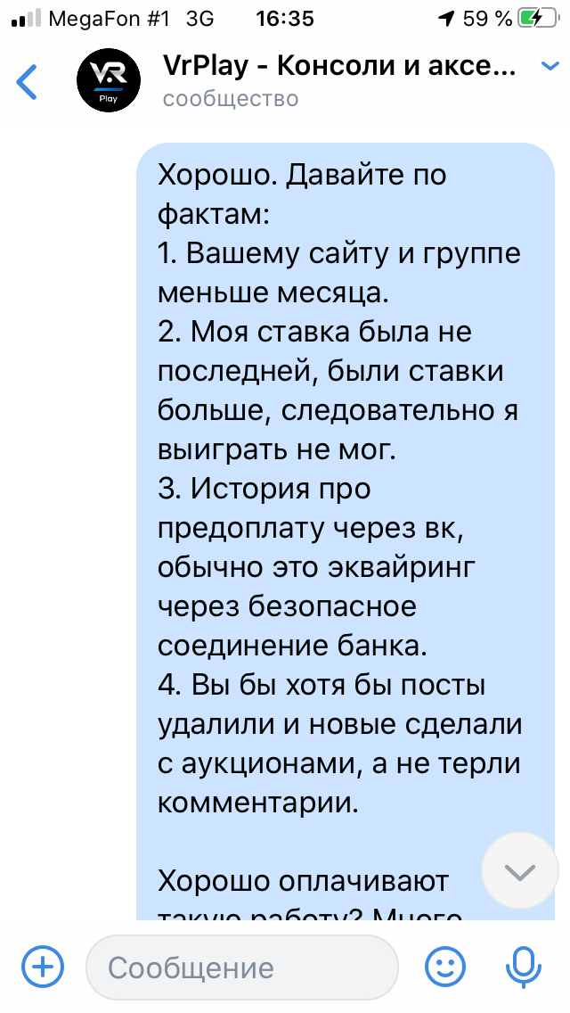 Далее следую диалог, где я высказываю аргументы про то, что они мошенники ( про сайт, группу и посты с аукционы)