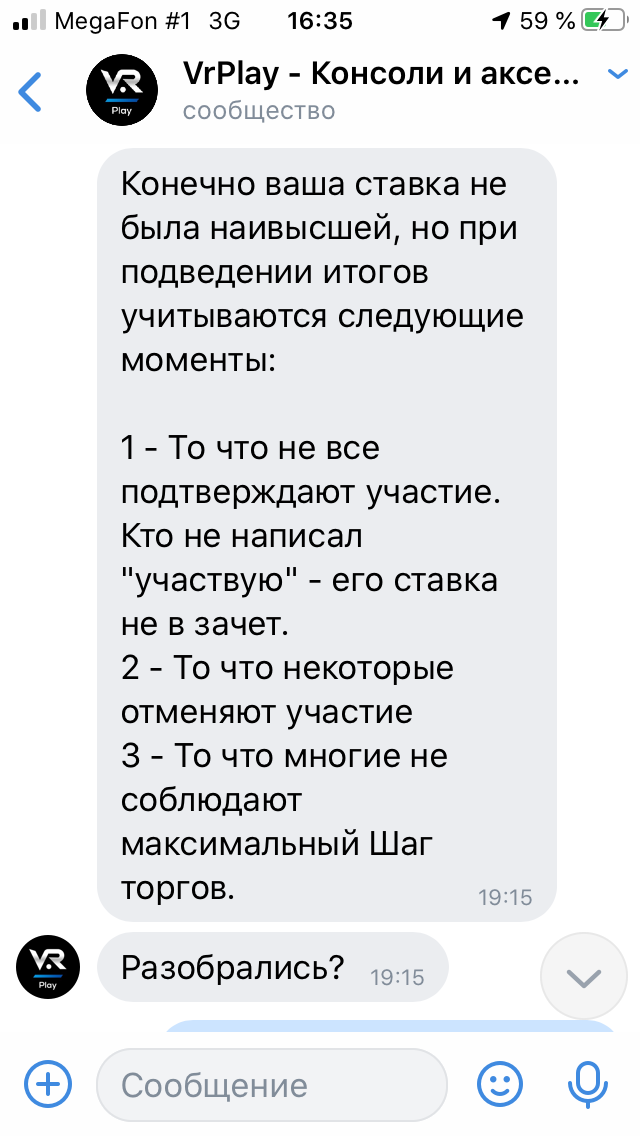 Внимательно прочитал условия написанные в посте к аукциону, я выполнил их, поставив сумму 7000 руб. или что-то в этом роде. Ниже увидел аналогичный пост только с xiaomi 8 pro от 3000 руб. Вот я сижу довольный и думаю, что либо я нашел халяву или это очередной обман. Группу добавил в закладки, чтобы не потерять и посмотреть чем кончится дело. Проверяя ставки через полчаса я обнаружил, что мою ставку успешно перебили, что было ожидаемо. Но было интересно узнать чем закончится аукцион и какая будет конечная цена.