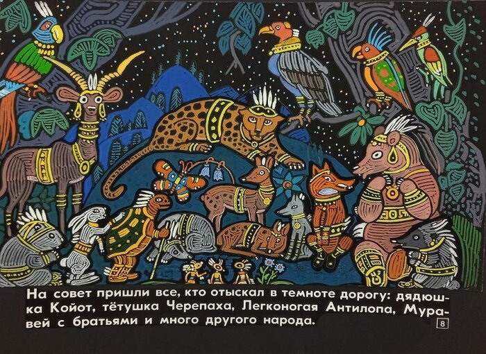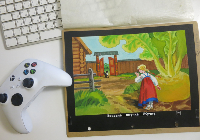 А вот так выглядит кадр диафильма, который собственно фотографировали. Иллюстрация, нарисованная художником, наклеена на черную бумагу и на плотный картон. Предметы рядом - для понимания размера.