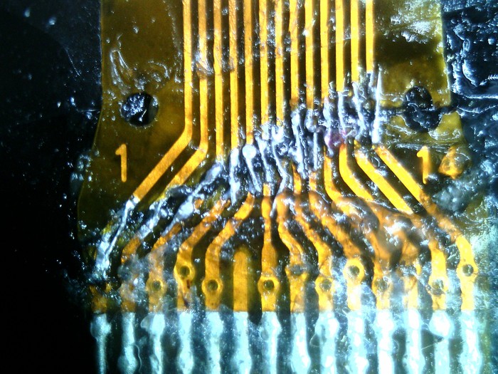 ну и рубанул я шлейф oled экранчика. игла от шприца для масштаба.