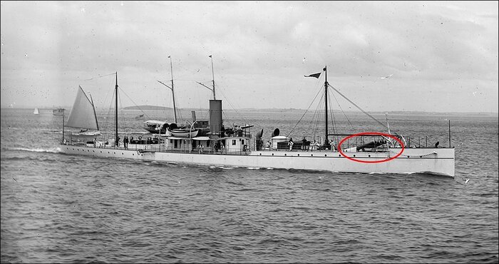Поскольку на аппарате со снимка стоит дата 1911 год, то корабль никак не мог быть построен раньше этого срока. Возможно, фото сделано на одном из российских линкоров, строившихся перед самой Первой мировой войной, а частично и во время неё. Скажем, на линкорах типа "Императрица Мария" было по четыре подводных 450мм торпедных аппарата в районе носовых артиллерийских башен по два с каждого борта.