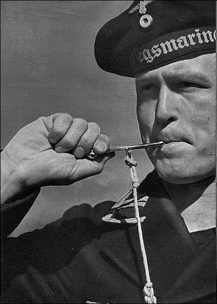 На снимке Лаутенслагер ещё не знает, что его ждёт, а моё внимание привлёк тянущийся к козырьку левой рукой моряк справа. Приглядевшись, я понял, что в правой он держит боцманскую дудку.