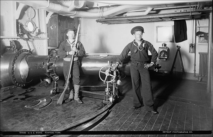Торпедный аппарат на USS Maine. Теперь всё понятно. Механизм служит для наведения аппарата в горизонтальной и похоже, немного и в вертикальной плоскости. Балка под подволоком - для перемещения и перезарядки торпед. Тогда тот груз есть противовес для наружной крышки аппарата, а задрайки фиксируют её в закрытом состоянии.