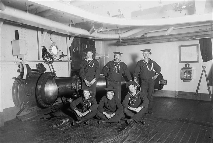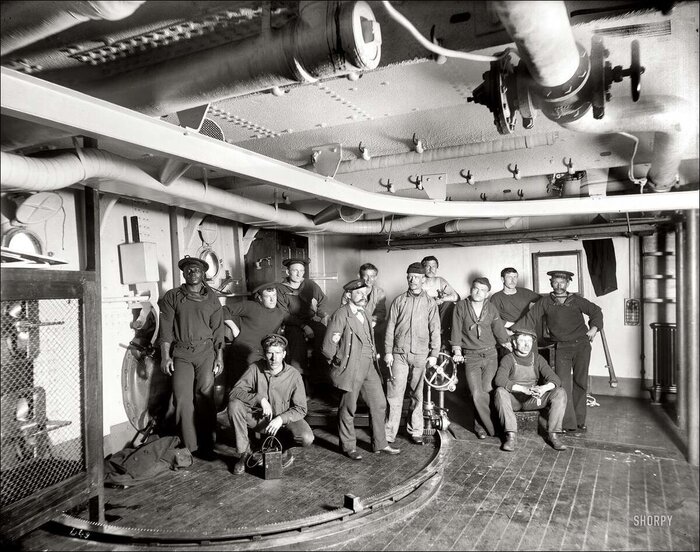Итак, решил предпринять небольшой мозговой штурм. Судя по одежде и могучим усам кое-кого - сделан он где-то в самом начале прошлого века на американском корабле. Пойдём по кругу слева направо.
