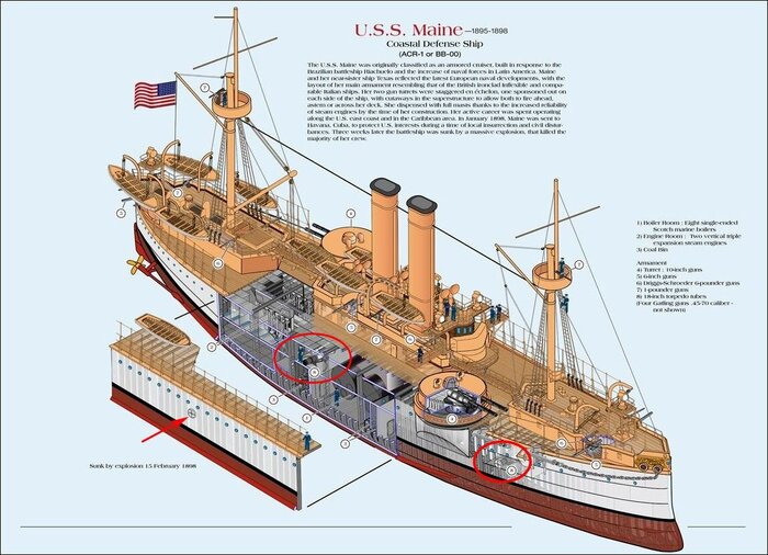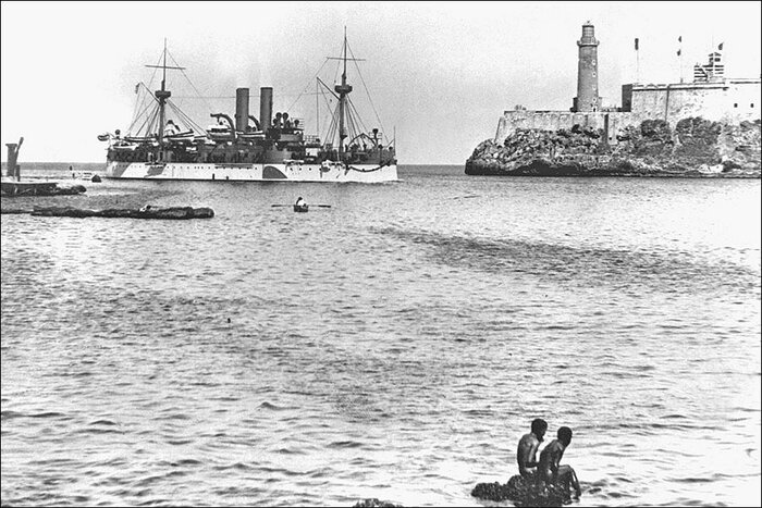 Это тот самый броненосный крейсер, который был взорван на рейде Гаваны 15 февраля 1898 года, что послужило поводом к началу испано-американской войны, в результате которой Кубу у испанцев отжали. Вот он входит в гавань Гаваны за три недели до взрыва: