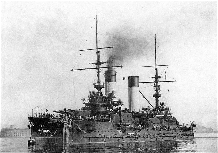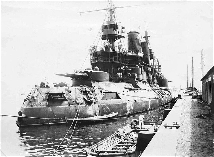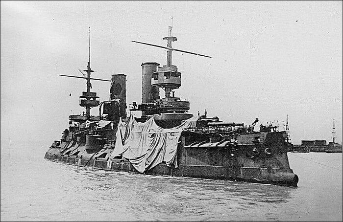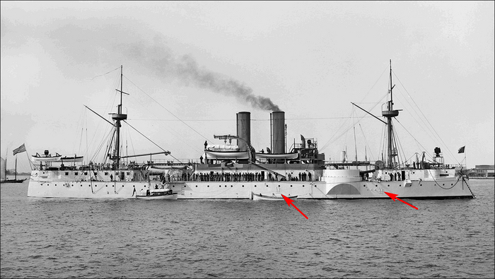 Как хорошо видно, аппарат располагался ниже ватерлинии. Это корма броненосца, а вот его нос, снимок сделан после сражения в Жёлтом море:
