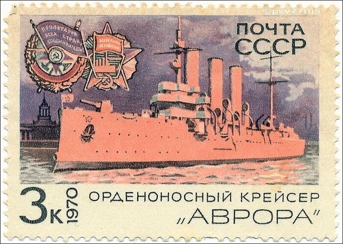 Однако вернёмся к торпедному аппарату. То, что он находится ниже уровня воды, сомнения не вызывает. И тут приходят на память тиражировавшиеся в миллионах экземпляров изображения крейсера "Аврора", вот почтовая марка:
