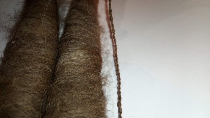 3) Хорошо спряденую пряжу даже из шерсти короткошерстных собак, порвать без усилия довольно таки трудно, т.к при прядении задается хорошая крутка, а при ссучивании со второй ниточкой - пряжа выравнивается, крутка распрямляется, пряжа получается хорошо сбалансированной.