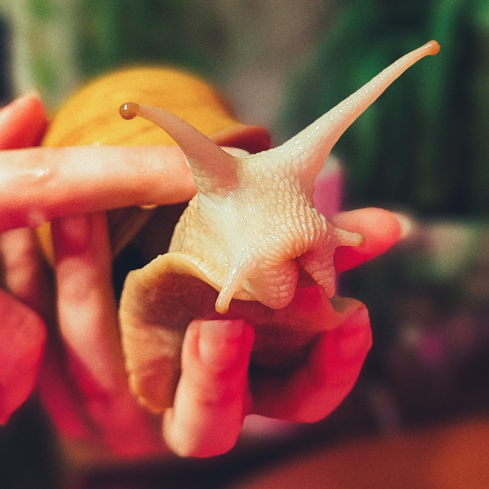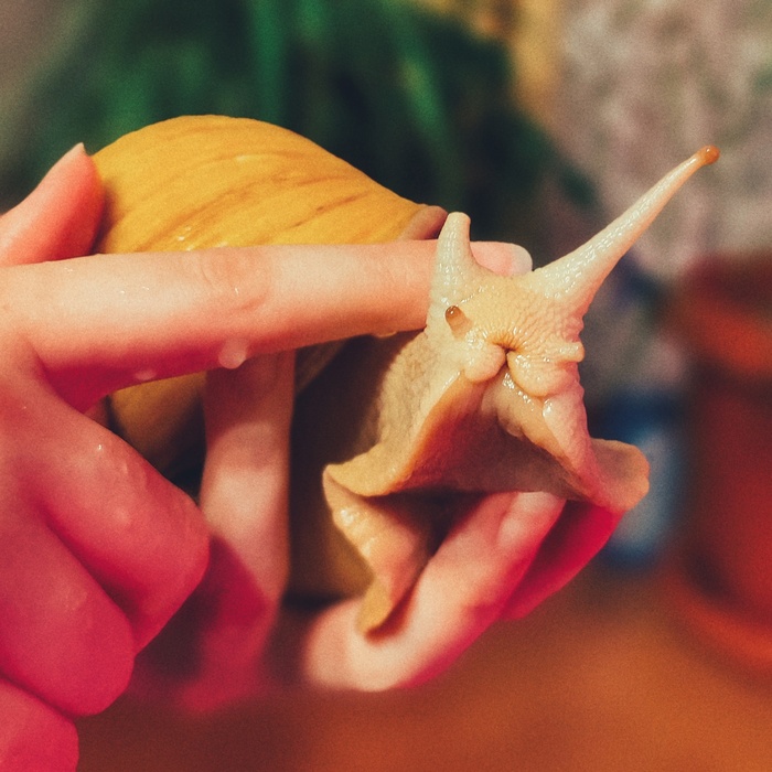 Папайя — наш локальный мем. Умеет строить смешные рожицы, обнимается со своими какашками, падает с потолка и совершает побеги из контейнера. Однажды проветривала контейнер, отодвинув крышку, когда вернулась — улитка уже ползла по картине позади стеллажа :)