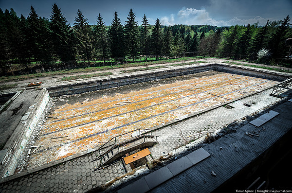 Особенная часть городского пейзажа — застывшие часы на школе в городе Томиока (Фукусима) и на бассейне «Лазурный» в Припяти. Время на часах справа не случайно: 1 час 23 минуты ночи — время аварии на ЧАЭС