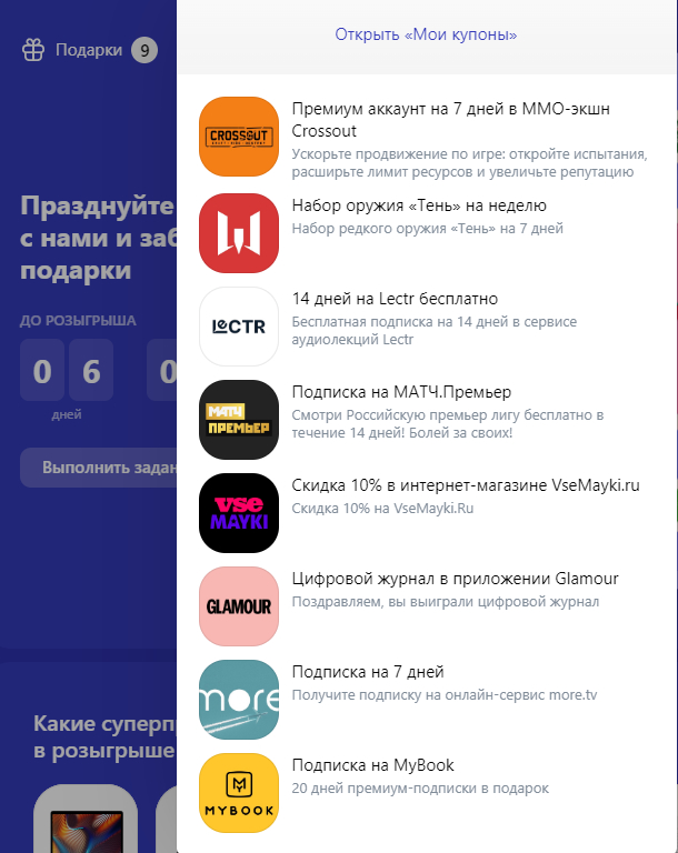 выиграв что-то ценнее подписки или скидки у партнеров тебе просто скажут произошла техническая ошибка держи чутка чекбитов (500 чекбитов =1 руб и потратить можно накопив 50 000 и то неизвестно где) и голосов на стикеры...Мыло, мыло никогда не меняется.