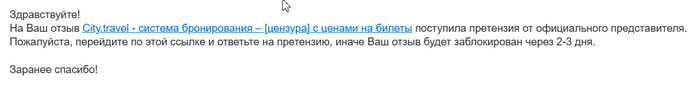 P.S. #otzovik.com #City.travel вы там вообще там вменяемые или совсем мозги на митингах прогундели. Был несчастный отзыв пятилетней давности с одним, сука, лайком, и вы решили поиграть в долбаных ковбоев и выпилить его из интернетов? Вы думаете Вам это так легко с рук сойдет?