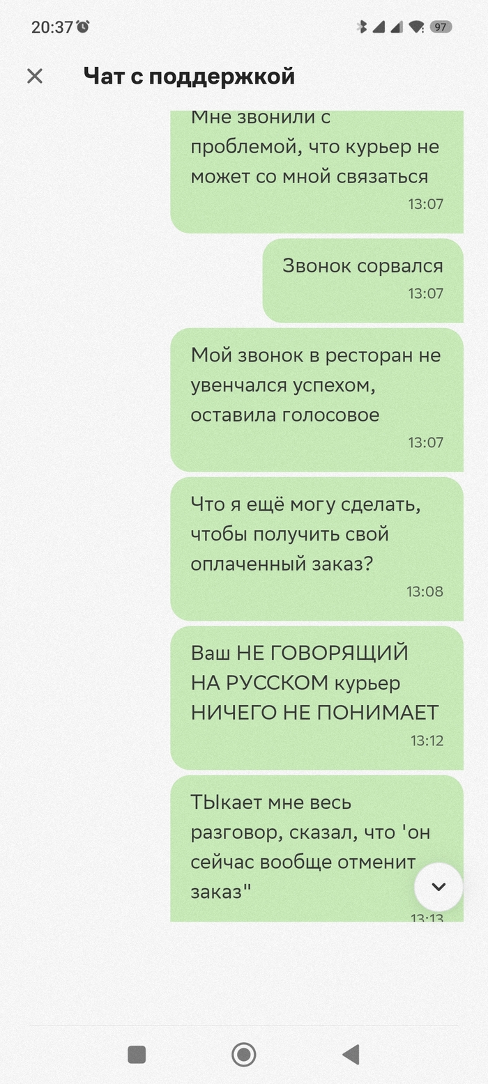 Опережаю вопросы- почему не позвонили курьеру? Нет в этом приложении связи с курьером, они возят через Яндекс, о чем мне сообщили на горячей линии, а я этого не знала.