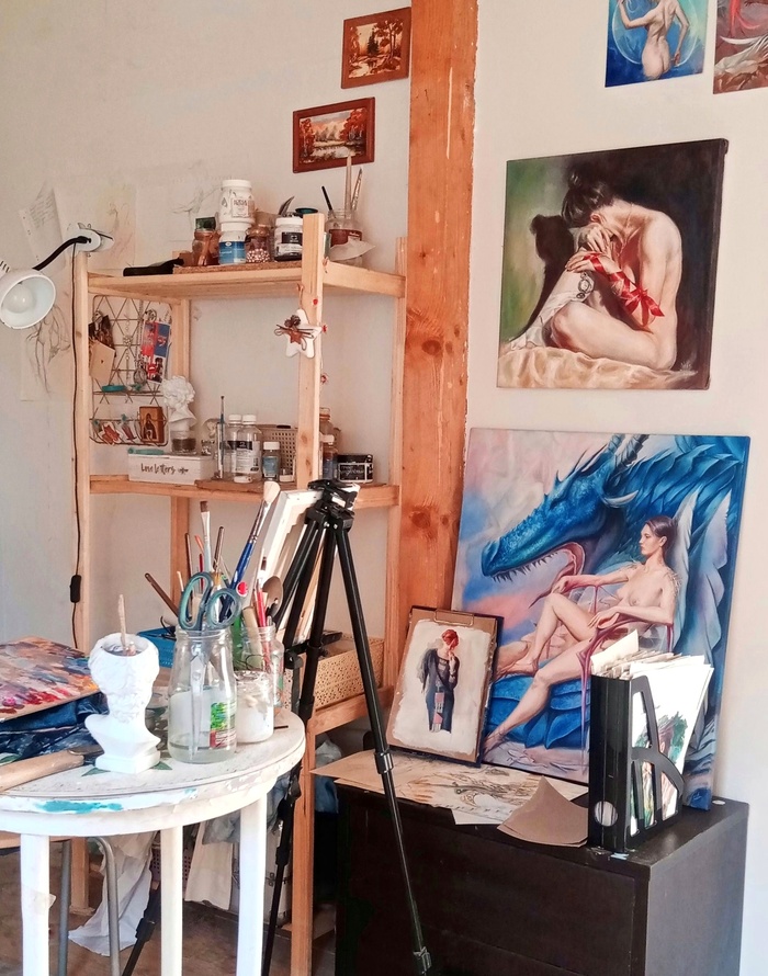 Она появилась у меня в 16 лет. Родители отдали мне веранду под мастерскую в нашем доме и полную свободу действий. Папа только стены побелил. Там я писала свои первые серьезные картины. Сейчас я уже давно с родителями не живу, отдельной мастерской нету, ее перенесла в квартиру. И дома этого больше нету, сгорел. Грустно, зато в памяти навсегда это место останется как желание поскорее закончить с делами, чтобы на рассвете или на закате распахнуть летом окна, сесть под солнце, и рисовать, рисовать, рисовать...