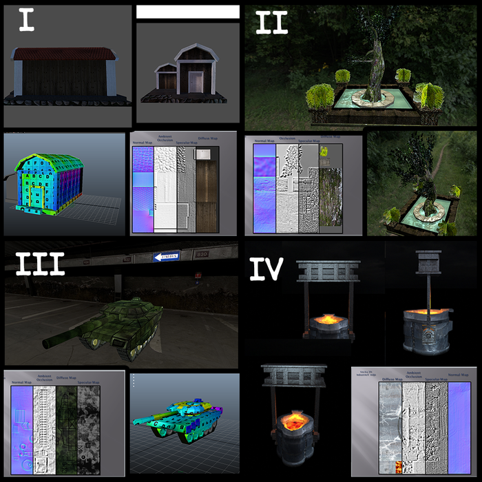 На этом предмете нам немного подробнее объяснили виды карт. Главным заданием было пощупать 4 типа карт: Diffuse Map – она же карта цвета, именно её обычно и называют текстурой, несмотря на то, что «текстура» это обобщение для всех карт. Specular Map – она же карта отражения света, во многом иллюзия материала – дерево, камень, пластик и т.д. создаётся благодаря разному отражению света от объекта. Ambient Occlusion – карта объемного света, но без света непосредственно от движка, например чтобы трещины между камней казались темнее. Normal Map – она же карта высот, создающая иллюзию многополигональности.