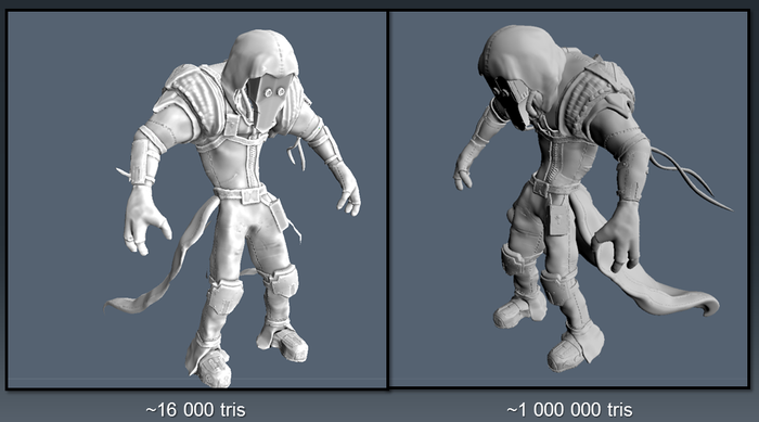 Полигоны нарисованы поверх модели, теперь все можно экспортивароть (например, в формат .obj), и помещать в Maya или в Marmoset Toolbag. Вот так выглядели две модельки в сравнении:
