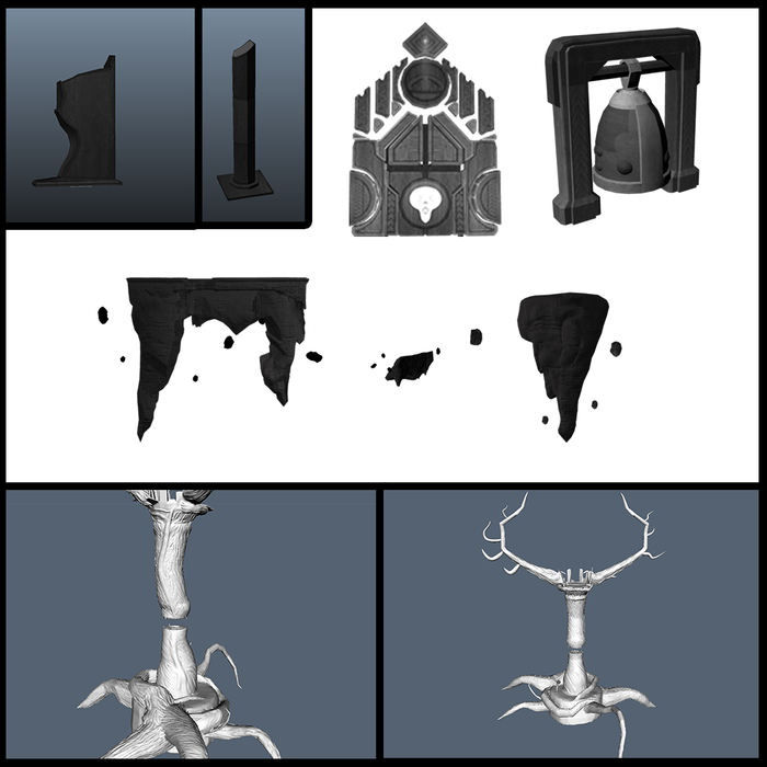 Разобравшись с персонажем, я начал помогать второму 3Д художнику с объектами. Мне довелось поработать над разнообразными колоннами, платформами, колоколом и даже деревом, которое должно было стать нашим 3-им уровнем.