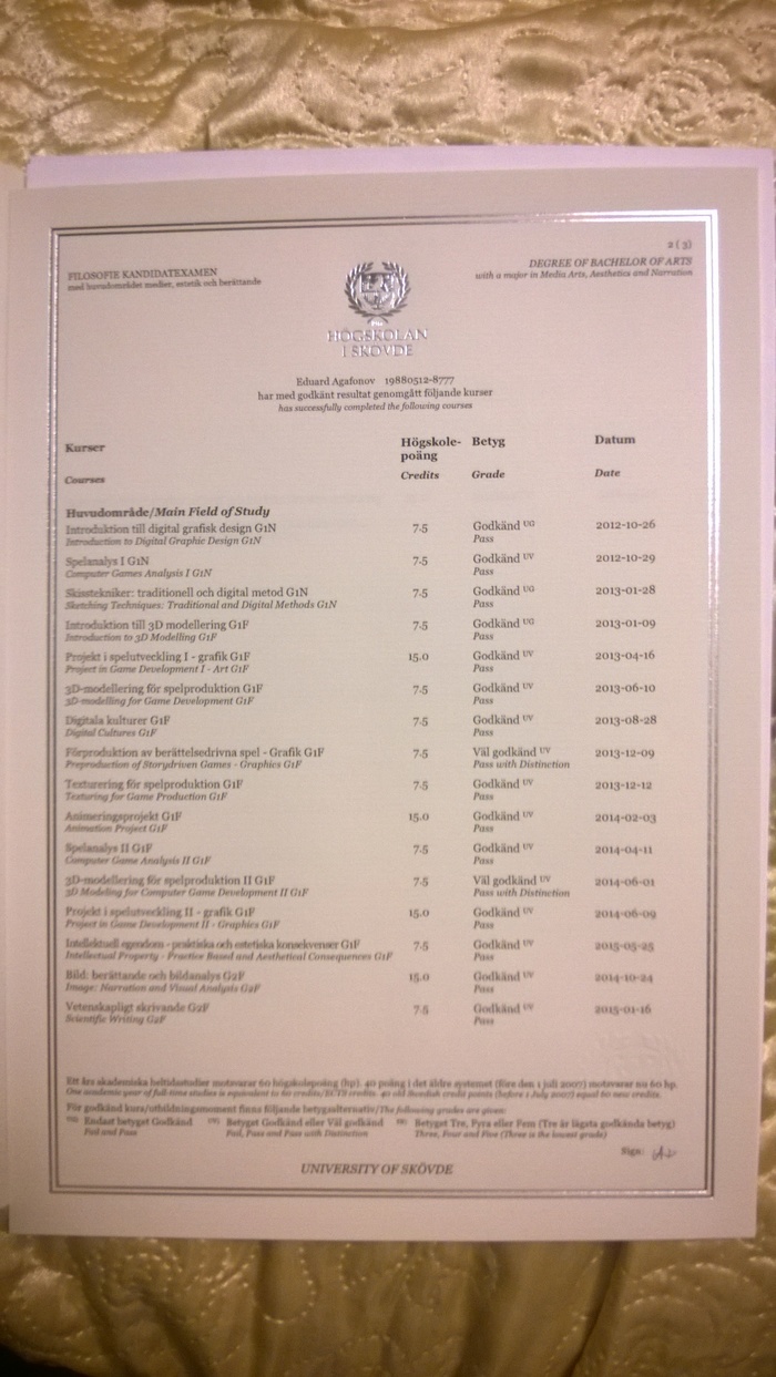 «VG» за текст, в этот раз означало «VG» за предмет «Preproduction of Storydriven Games(EN)», потому что за групповую работу на предмете и за семинар мы получали только «U» или «G». Ах да, наверное, некоторые сейчас удивятся, что оценки ставятся по результатам текста, а не по результатам практических заданий. Да, в этот раз было именно так, и это будет далеко не единичный случай. И меня это тоже сильно удивляло на протяжении всего времени обучения. Но, так или иначе, я был рад тому, что получил свою первую «VG» в институте, на программе, преподаваемой на неродном мне языке.