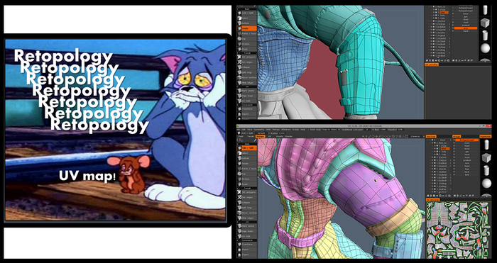 Для этого мы в программе 3D Coat начинаем планомерно покрывать модель полигонами. И здравствуй новый кошмар рутины: Retopology. Ретопология занимает особое место в моем сердце, рядом с UV разверткой. Все мои попытки следовать урокам по автоматической ретопологии в 3D Coat не привели к результатам, а времени и желания, чтобы сидеть и изучать такие сторонние программы как TopoGun - не было. Пришлось делать ретопологию в 3D Coat вручную.