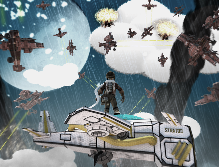 2D художник начал рисовать персонажей, делать задники, которые я запихивал в афтер эффект и создавал на этой основа простенький ролик для финальной презентации. Второй 3Д художник реализовывал концепты персонажей в 3Д и изучал «cel shading», а аниматор… просто старался сидеть тихо и не отсвечивать. К сожалению, он нас сразу предупредил, что в автер эффект он не может, да и в Maya анимирует довольно плохо. Я быстренько сделал ему кубик-данных(нужный по сюжету предмет) и сказал анимировать, чтобы мы на презентации спокойно могли говорить, что наш 4-ый член команды тоже учувствовал в процессе. Так же, я выпросил кое-что для себя помоделировать, несмотря на то, что был почти полностью загружен презентационным роликом. Этим «кое-чем» стала 3Д модель дирижабля, который по лору являлся базой главного героя.