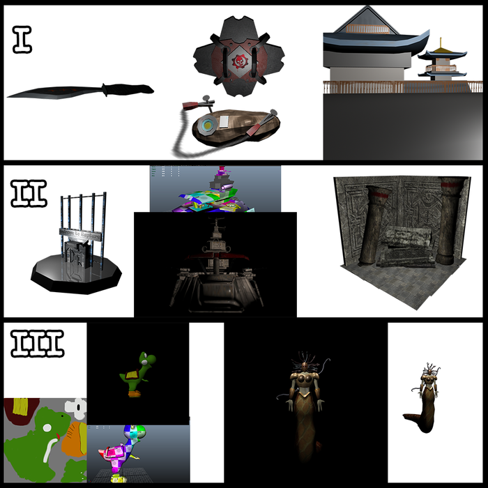 Для игры «Crysis» я сделал ножик по уроку, найденному на Ютуб. Для игры «Gears of War» получилось подобие щита с логотипом. Для «Street Fighter X Tekken» набросок уровня, вот тут конечно ошибка, потому что это уже не «Props», а «Environments», но благо учитель не отправил меня на переделку, а просто указал на ошибку. Так же преподаватель просил показывать UV карту, чего я не делал, но мне это сошло с рук, просто нужно было не забыть в следующий раз.