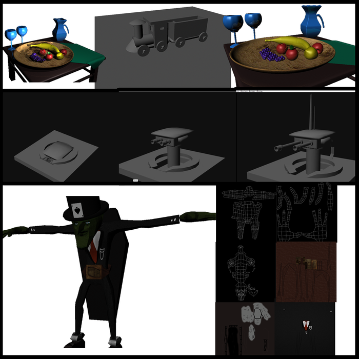 Заданиями на курсе было сделать в Maya: детскую игрушку, простенькую анимацию, стол с фруктами и персонажа. Первые задания были относительно просты, да и лекции с практиками довольно наглядно показывали необходимый нам инструментарий. Для детской игрушки я нарисовал паровозик, фруктовый стол был воспроизведен по уроку с ютуба. Анимация в Maya с keyframes мне напомнила анимацию в Афтер Эффекте, так что проблем не возникло, и на выходе получилась простенькая пушечка в стиле Звездных Войн, которая вылезает, разворачивается и стреляет.