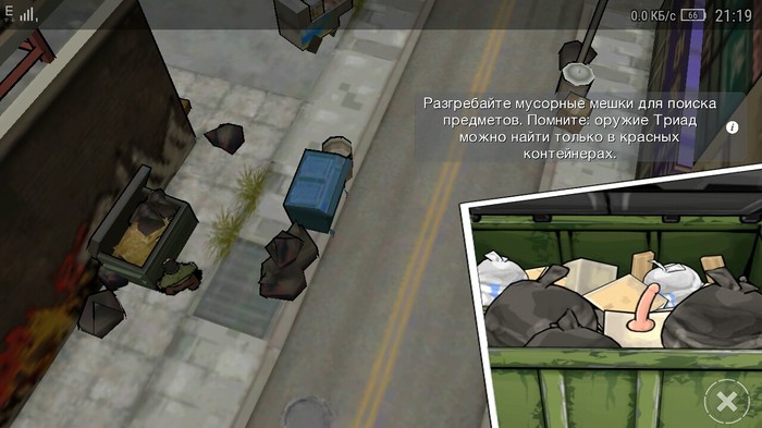 Ещё одна фишка-мусорные контейнеры. Есть два вида: зелёный и красный. В зелёном можно найти мусор или что то полезное: бургег, хот-дог, наркотики, деньги. В красном всегда есть оружие, в основном начальное
