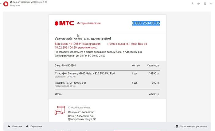 15 февраля 2021 в подарок любимой тёще, коротающей заслуженный отдых в славном городе Сочи, заказал на сайте интернет магазина МТС в подарок симпатичный красненький телефон Samsung S20, по довольно заманчивой, но отнюдь не малой цене!